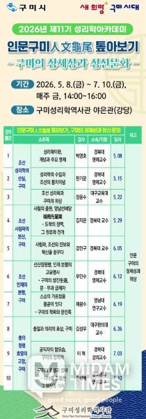 강좌는 5월 8일부터 7월 10일까지 매주 금요일 오후 2시부터 4시까지 운영된다. 박사급 이상 전문 강사를 초빙해 조선성리학의 산실’, ‘조선사림파의 본산’, ‘조선인재의 본향’, ‘충의·청렴·효열의 표상’ 등 구미가 지닌 인문적 가치를 다각도로 조명한다. 이를 통해 15세기 이후 이어온 인문도시로서의 위상을 재확인하고, 시민들의 자긍심을 높이는 데 초점을 맞췄다.