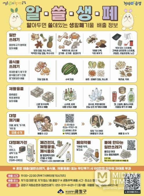미담타임스 남혜영 기자 | 부산 금정구는 생활폐기물 배출에 대한 주민 불편을 해소하고 올바른 분리배출 문화 정착을 위해 ‘알‧쓸‧생‧폐’(알아두면 쓸데 있는 생활폐기물 배출 정보) 홍보지 제작에 나선다고 밝혔다.