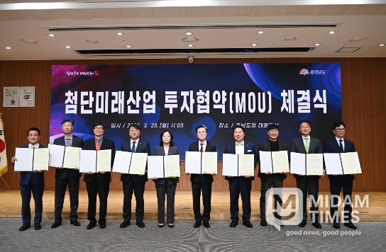 김태흠 지사는 30일 도청 대회의실에서 오세현 아산시장 등 3개 시군 시장·군수, 김동회 디앤알파트너스 대표이사 등 6개 기업 대표와 투자협약(MOU)를 체결했다.