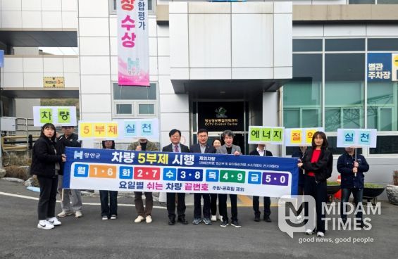 미담타임스 황명수 기자 | 함안군은 최근 중동 정세 불안에 따른 에너지 수급 위기에 대응하고 공공기관의 선도적 에너지 절약 실천을 위해 지난 30일부터 직원 자가용 차량 5부제(요일제)를 시행한다고 밝혔다.