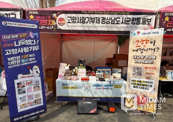 미담타임스 황명수 기자 | 통영시는 지난 27일 제64회 진해군항제 행사장인 여좌천 일원에서 고향사랑기부제 부스를 운영하며 방문객을 대상으로 집중 홍보를 펼쳤다. 시는 전단지 배부 및 다양한 이벤트 등 홍보 활동을 통해 만개한 벚꽃에 지지 않을 만큼 통영에 대한 고향사랑을 꽃피웠다.