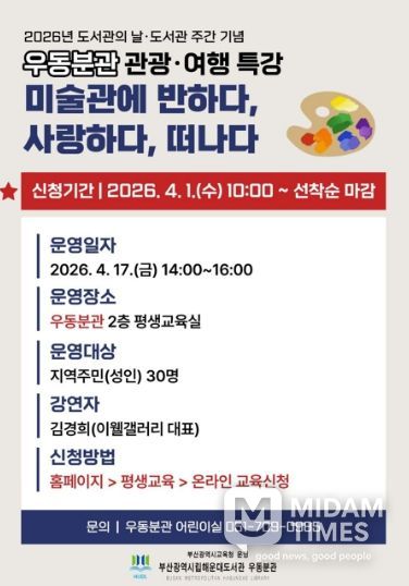 미담타임스 남혜영 기자 | 부산광역시립해운대도서관은 도서관의 날・도서관주간을 맞아 4월 17일 해운대도서관 우동분관에서 지역주민 30명을 대상으로 관광·여행 특강 ‘미술관에 반하다, 사랑하다, 떠나다’를 운영한다.