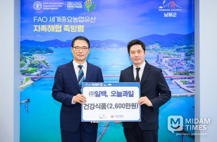 미담타임스 황명수 기자 | 주식회사 일백과 오늘과일은 지난 3월 30일 2천 600만원 상당의 건강식품(과일효소외 4종)을 남해군에 기탁했다.