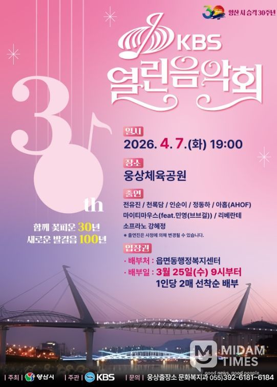 미담타임스 황명수 기자 | 양산시가 시 승격 30주년을 기념하고 ‘2026 양산방문의 해’를 널리 알리기 위해 4월 7일(화) 저녁 7시 웅상체육공원 축구장에서‘KBS 열린음악회’를 개최한다고 밝혔다.