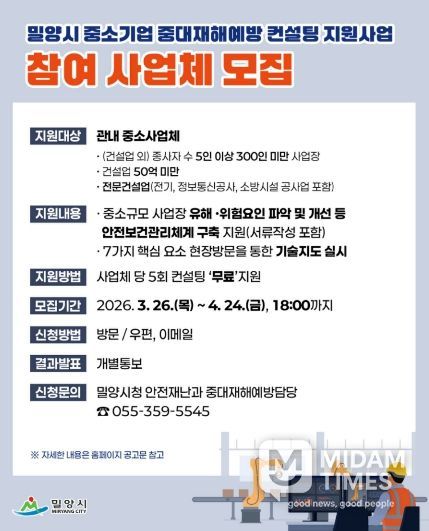 미담타임스 황명수 기자 | 경남 밀양시는 안전보건관리체계 구축에 어려움을 겪는 관내 중소기업을 대상으로 ‘2026년 밀양시 중대재해예방 컨설팅’ 사업을 추진한다고 밝혔다.