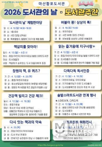 미담타임스 황명수 기자 | 마산합포도서관에서는 ‘도서관의 날’과 ‘도서관주간’을 맞아 지역 주민의 독서문화 확산과 도서관 이용 활성화를 위해 다양한 참여형 프로그램을 운영한다.