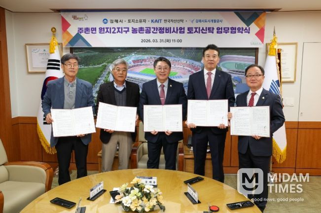 미담타임스 황명수 기자 | 김해시는 주촌면 원지2지구 농촌공간정비사업 추진을 위해 31일 오전 11시 시장실에서 토지소유자, 한국자산신탁(주), 김해시도시개발공사와 함께 토지신탁을 위한 ‘4자 업무협약’을 체결했다.
