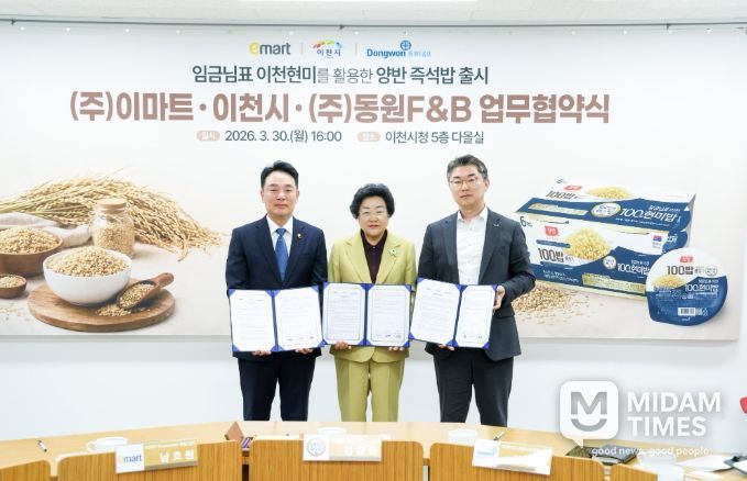 미담타임스 김준완 기자 | 이천시는 3월 30일 이천시청에서 ㈜동원F&B, ㈜이마트와 함께 ‘임금님표이천 현미 즉석밥’ 출시를 위한 업무협약(MOU)을 체결하고, 쌀 소비 촉진과 농업인 소득 안정화를 위한 협력체계를 구축했다고 밝혔다.