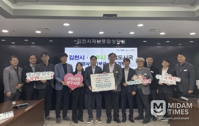 미담타임스 김준완 기자 | 상주시 건설도시국에서는 3월 31일 김천시청에서 김천시 건설도시국을 비롯한 부서 관계자들이 참석한 가운데‘고향사랑 기부제’상호기부 협약식을 가졌다.