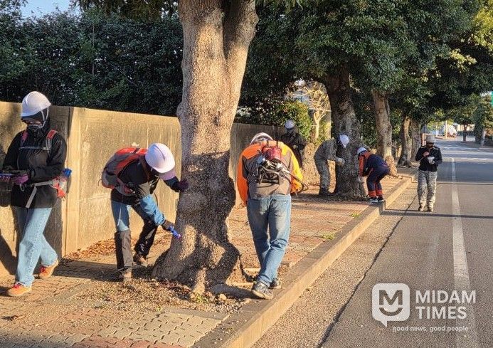 미담타임스 김준완 기자 | 서귀포시는 가로수로 인한 병해충 피해저감과 효율적인 관리를 위해 후박나무 가로수에 대하여 기존 고압 지상살포 방식의 단점을 보완해 약제를 나무에 직접 주입하는 수간주사 방식을 도입했다.