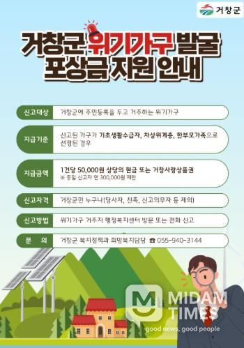 미담타임스 황명수 기자 | 거창군은 복지 사각지대에 놓인 위기가구를 조기에 발굴하고 필요한 자원을 연계하기 위해 ‘위기가구 발굴 포상금 지원 제도’를 운영한다.