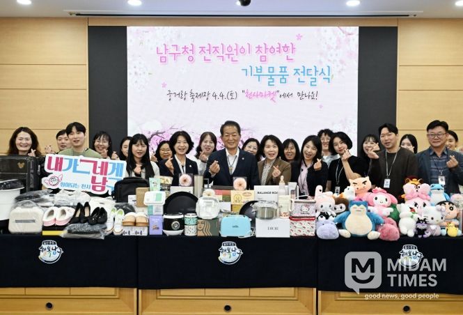 미담타임스 김준완 기자 | 울산 남구는 1일 남구 직원들이 직접 모은 기부물품을 궁거랑 벚꽃한마당에서 나눔천사기금 홍보와 천사마켓을 운영하는 무거동 지역사회보장협의체에 전달했다.