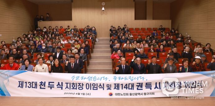 미담타임스 김준완 기자 | 대한노인회 울산 동구지회(지회장 권득시)는 4월 1일 오전 10시 동구청 5층 중강당에서 경로당 회장 및 총무, 지회 임원 등 160여 명이 참석한 가운데 노인지회장 이취임식 및 2026년도 노인 지도자 업무 연찬회를 가졌다.