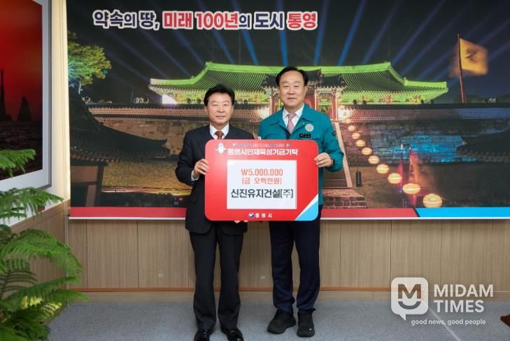 미담타임스 황명수 기자 | 통영시는 지난 1일 신진유지건설(주)(대표 김인식)에서 인재육성기금 500만 원을 기탁했다고 밝혔다.