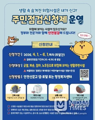 미담타임스 황명수 기자 | 고성군은 2026년 집중안전점검 기간(4월 20일~6월 19일) 동안 군민이 직접 참여하는'2026년 집중안전점검 주민점검신청제'를 운영한다고 밝혔다.