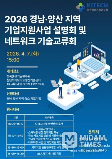 미담타임스 황명수 기자 | 양산시는 오는 7일 한국생산기술연구원 첨단하이브리드생산기술센터 세미나실에서 지역 산업 발전 촉진과 관내 제조기업의 기술 혁신을 도모하기 위해 ‘2026년 기업지원사업 설명회 및 네트워크 기술교류회’를 개최한다고 밝혔다.