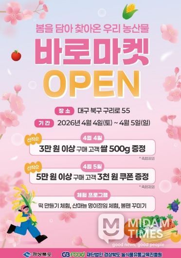 미담타임스 김준완 기자 | 경상북도는 오는 4월 4일부터 12월 6일까지 매주 토․일요일 오전 9시부터 오후 5시까지 대구시 북구 구리로에 위치한 경상북도 농업자원관리원에서 바로마켓 경상북도점을 운영한다고 밝혔다.