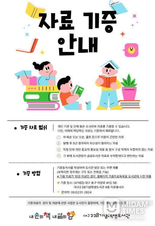 미담타임스 전해찬 기자 | 대구시교육청 10개 공공도서관은 지역 사회의 독서문화 활성화와 지식정보 자원 공유를 위해 개인 및 기관·단체를 대상으로 양질의 자료 기증을 4월부터 연중 접수한다고 밝혔다.