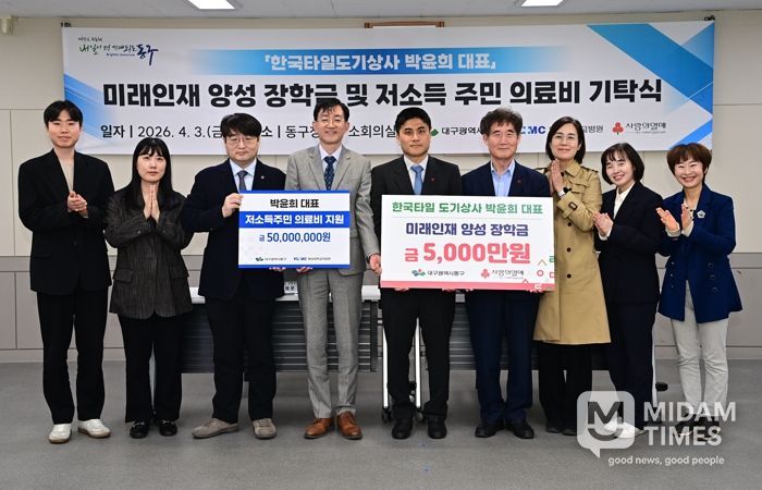 미담타임스 전해찬 기자 | 박윤희 한국타일도기상사 대표는 지난 3일, 지역의 미래를 짊어질 인재 양성과 의료사각지대 해소를 위한 성금 1억원을 동구청에 기탁했다.