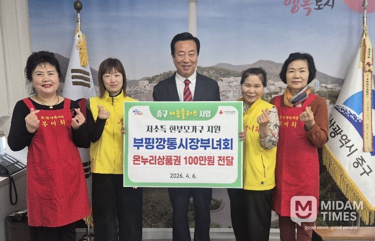 미담타임스 남혜영 기자 | 부산 중구 부평깡통시장부녀회(회장 최남숙)에서 지난 6일 중구청을 방문하여 저소득 한부모가구 지원을 위해 회원들이 정성껏 모은 이웃돕기성품(온누리상품권 100만원)을 전달했다.