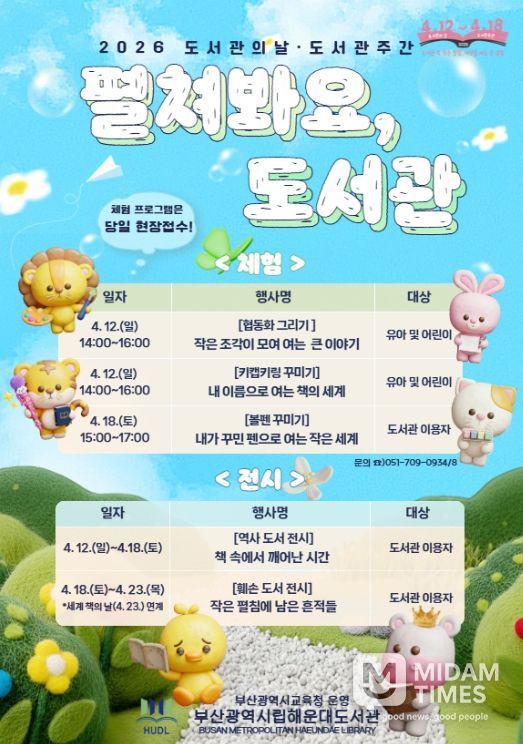 미담타임스 남혜영 기자 | 부산광역시립해운대도서관은 오는 12일부터 23일까지 해운대도서관에서 유아·어린이, 도서관 이용자를 대상으로 참여형 체험·전시 프로그램 ‘펼쳐봐요, 도서관’을 운영한다.
