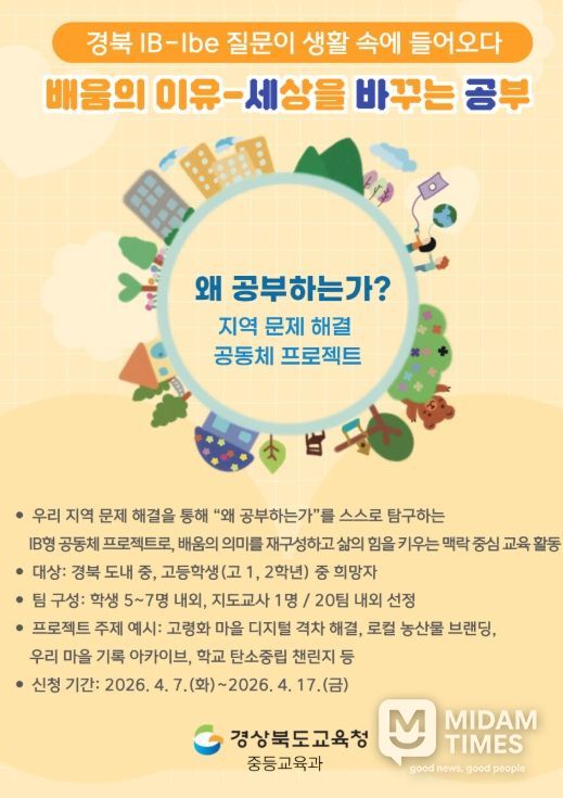 미담타임스 김준완 기자 | 경북교육청은 학생들이 스스로 질문하고 삶과 연결된 배움을 실천하는 교육을 위해 ‘배움의 이유–세바공(세상을 바꾸는 공부)’ 프로그램을 운영하고, 오는 17일까지 참여 학생을 모집한다고 밝혔다.
