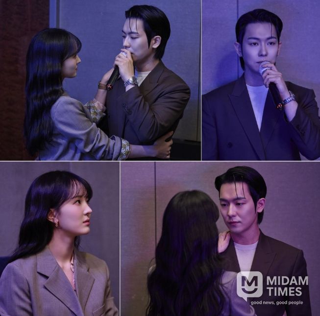 이와 관련 백서라와 안우연이 숨소리가 느껴질 정도로 가까이 밀착한 ‘아찔 심멎 블루스 타임’ 순간이 포착돼 긴장감을 고조시킨다. 극 중 몽환적인 조명 아래 마이크를 잡은 하용중이 노래를 부르는 가운데 김진주의 뇌를 지닌 모모가 하용중을 지그시 바라보는 장면. 이어 모모(김진주 뇌)가 갑자기 자리에서 일어나 하용중에게 다가가고 두 사람은 서로에게 시선이 꽂힌 채로 눈을 떼지 못한다. 어깨와 허리를 감싸안은 두 사람이 묘한 설렘을 자아내면서, 과연 모모(김진주 뇌)와 하용중 사이에 급진전이 있을지 두 사람의 운명이 어떤 후폭풍을 유발할지 궁금증을 모은다.