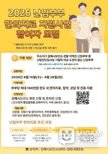미담타임스 황명수 기자 | 김해시는 오는 15일부터 28일까지 ‘난임부부 한의치료 지원사업’ 참여자를 모집한다고 10일 밝혔다.