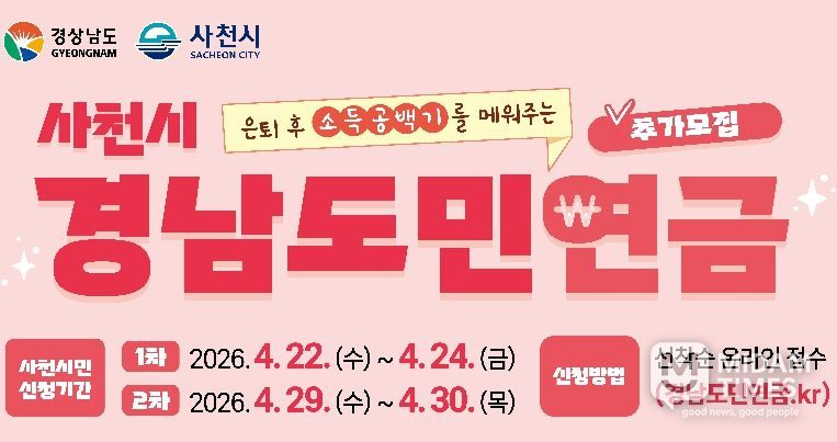 미담타임스 황명수 기자 | 사천시가 은퇴 후 소득 공백기를 대비하기 위한 ‘2026년 경남도민연금 지원사업’ 가입자를 추가 모집한다고 10일 밝혔다.