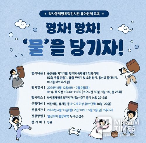 미담타임스 김준완 기자 | 울산 약사동제방유적전시관이 관내 어린이집과 유치원 원아를 대상으로 울산의 고유 수리민속을 체험하는 '영차! 영차! 물을 당기자!' 교육 프로그램을 운영한다.