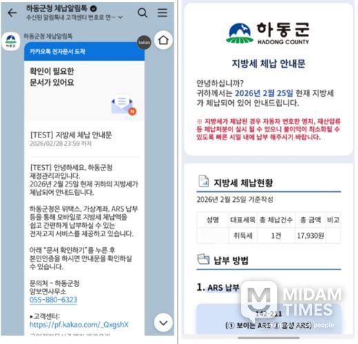 미담타임스 황명수 기자 | 하동군은 카카오 알림톡을 활용한 체납세 안내 서비스를 시행한 결과, 징수 실적이 크게 향상됐다고 밝혔다.
