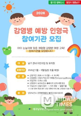 미담타임스 전해찬 기자 | 대구 남구보건소는 '2026년 수요자 맞춤형 찾아가는 감염병 예방 교육'의 일환으로 어린이의 눈높이에 맞춘 감염병 예방 교육을 위해 ‘어린이 감염병 예방 인형극’ 참여기관을 4월 13일부터 4월 16일까지 모집한다.