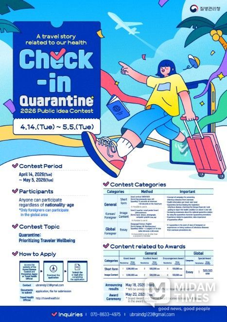 미담타임스 공한별 기자 | 질병관리청은 건강한 해외여행 문화를 확산하고 여행자 건강 중심 검역에 대한 국민 인식을 높이기 위해 4월 14일부터 5월 5일까지 '체크인, 검역 : 우리가 만드는 여행건강 이야기, 국민 생각 공모전'을 개최한다.