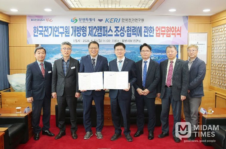 미담타임스 황명수 기자 | 창원특례시와 한국전기연구원(KERI)은 4월 13일 ‘한국전기연구원 개방형 제2캠퍼스’ 조성을 위한 업무협약을 체결했다고 밝혔다. 이날 협약식은 창원시청에서 열렸으며, 장금용 창원특례시장 권한대행과 김남균 KERI 원장 등 양 기관 주요 관계자들이 참석했다.