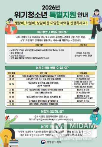 미담타임스 김준완 기자 | 청도군은 경제적 어려움, 학업 중단, 가정 문제 등으로 위기 상황에 놓인 청소년을 돕기 위해 [2026년 상반기 청도군 위기청소년 특별지원사업 집중 신청기간]을 지난 4월 8일부터 오는 5월 7일까지 운영한다.