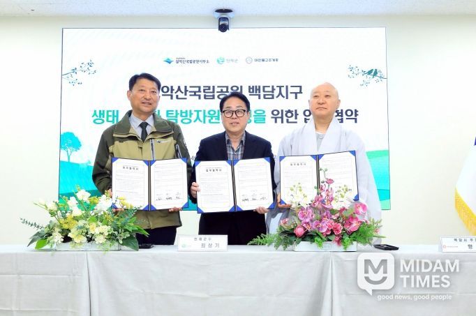 미담타임스 김준완 기자 | 인제군은 14일 설악산국립공원사무소에서 국립공원공단 설악산국립공원사무소, 대한불교조계종 백담사와 함께 ‘설악산 백담지구 생태·문화 탐방자원 조성’을 위한 업무협약(MOU)을 체결했다.