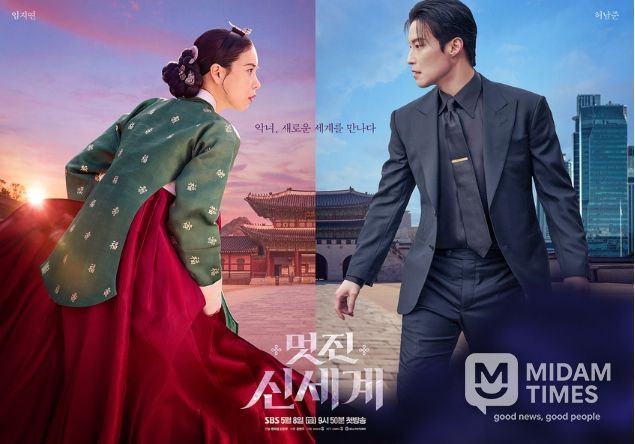 이 가운데 14일(화), ‘멋진 신세계’ 측이 ‘조선악녀’ 강단심(임지연 분)과 ‘악질재벌’ 차세계(허남준 분)의 운명적 조우를 그려낸 듀오 포스터를 공개해 이목을 집중시킨다. 공개된 포스터 속 두 사람은 같은 공간, 다른 시간 속에서 서로를 마주하고 있는 모습. 18세기 조선의 단심과 21세기 대한민국의 세계가 만들어낸 데칼코마니 구도가 흥미를 높인다. 두 사람 사이에는 상대의 신세계를 향한 호기심과 경계심, 운명적 이끌림이 느껴진다. 특히 단 한 번의 눈맞춤으로도 강렬한 아우라를 발산하는 이들의 케미스트리에 기대가 모인다.