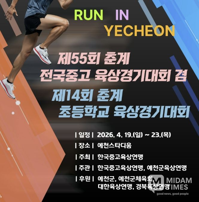 미담타임스 김준완 기자 | 예천군은 오는 19일부터 23일까지 닷새간 예천스타디움에서 '제55회 춘계 전국 중·고 육상경기대회' 및 '제14회 춘계 전국초등학교 육상경기대회'를 개최한다고 밝혔다.
