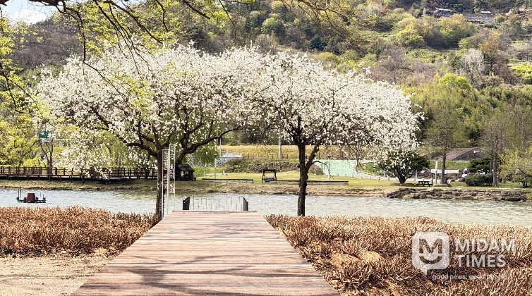 잔잔한 호수 위로 순백의 꽃망울이 은은하게 피어나 고요한 수면과 어우러지며, 마치 한 폭의 수채화를 펼쳐놓은 듯한 봄 풍경을 선사하고 있다.