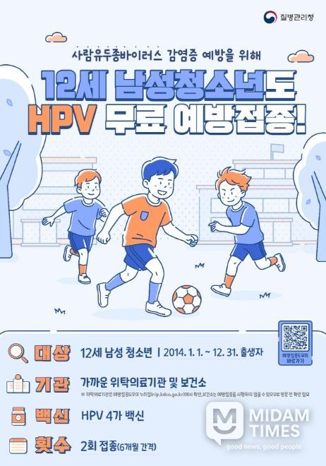 미담타임스 조혜리 기자 | 질병관리청은 2026년 5월 6일부터 12세 남성 청소년(2014년생)을 대상으로 사람유두종바이러스(Human Papillomavirus, HPV) 백신 국가예방접종 지원사업을 새롭게 시행한다.
