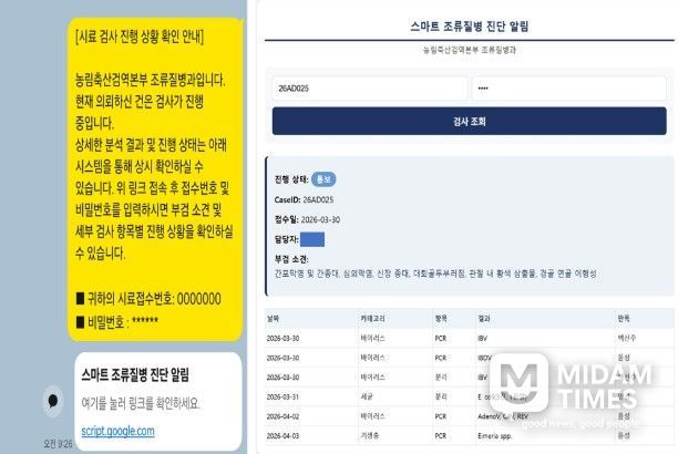 미담타임스 김준완 기자 | 농림축산검역본부는 2~3월간 시범 운영을 마친 후 4월 1일부터 ‘스마트 조류질병 진단 알림’ 모바일 서비스 시스템을 본격 운영하고 있다고 밝혔다. 해당 시스템에서는 닭, 오리, 앵무새 등 조류의 폐사 원인을 규명하기 위해 신청자가 검사를 의뢰하는 경우 부검 소견과 세부 검사 진행 과정을 실시간으로 확인할 수 있다.
