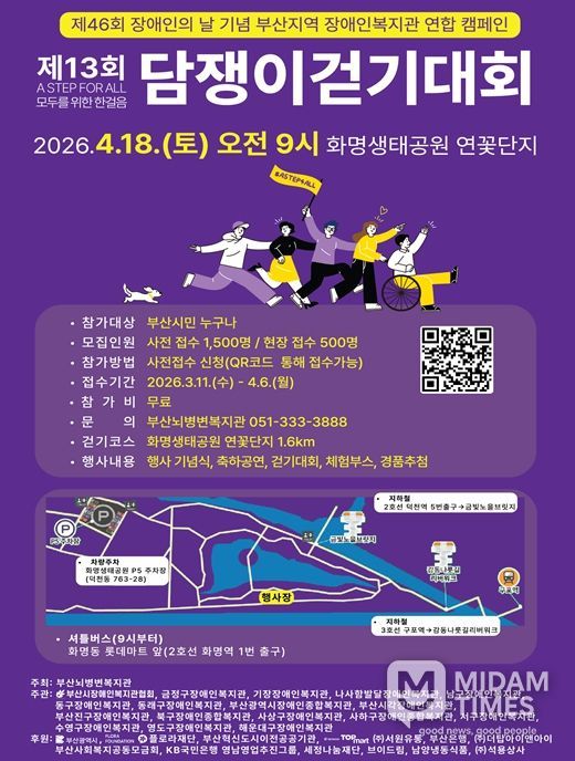 미담타임스 남혜영 기자 | 부산시는 장애인의 날(4.20.)을 맞이해 내일(18일) 오전 9시 화명생태공원에서 '제13회 담쟁이 걷기대회'가 열린다고 밝혔다.