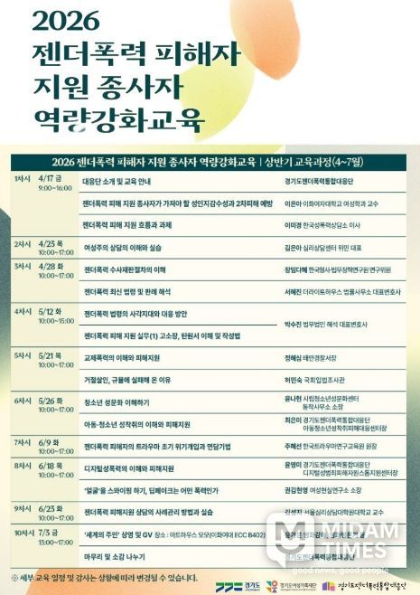 미담타임스 정주환 기자 | 경기도와 경기도젠더폭력통합대응단이 17일 도내 젠더폭력 피해 지원 현장 종사자들의 전문성 향상을 위한 ‘2026 역량강화 교육’ 상반기 과정을 시작하며 현장 대응력 강화에 나섰다.
