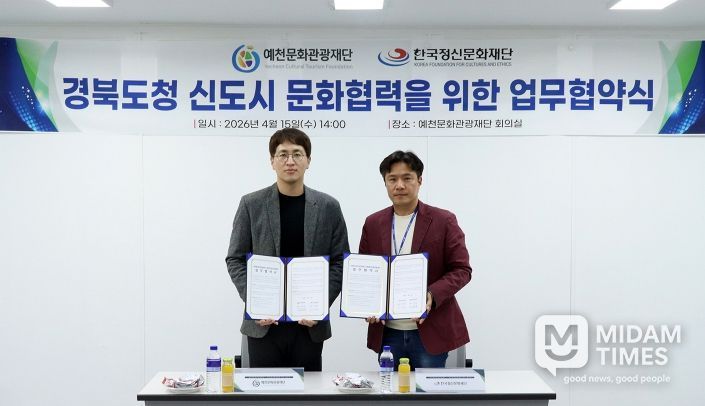 미담타임스 김준완 기자 | (재)한국정신문화재단과 (재)예천문화관광재단이 안동과 예천을 잇는 광역 연계 생활권 기반 문화협력의 물꼬를 텄다. 양 기관은 지난 15일 예천군문화회관에서 ‘경북도청 신도시 문화협력을 위한 업무협약(MOU)’을 체결하고, 공동 문화사업 추진을 위한 상호 협력 체계를 구축했다고 밝혔다.