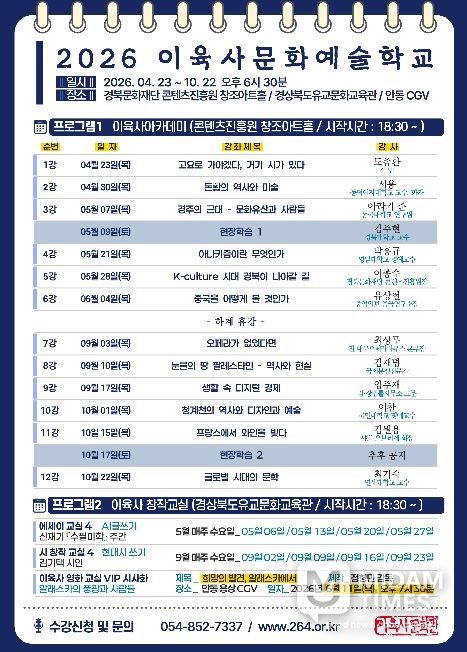 미담타임스 김준완 기자 | 안동시 이육사문학관은 4월 23일부터 '2026 이육사문화예술학교'를 개강한다. '2026 이육사문화예술학교'는 국내외 저명 강사들이 참여해 인문․예술 전반의 다양한 주제를 다루며, 시민이 일상에서 인문학의 깊이를 체감할 수 있도록 풍성하고 내실 있는 강연으로 운영된다.