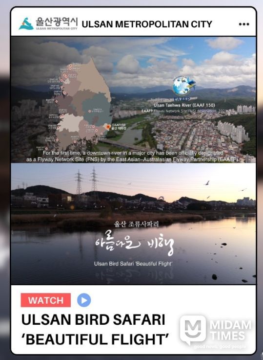 미담타임스 김준완 기자 | 울산시는 ‘울산 조류사파리’홍보영상이 국제철새기구 공식관계망(채널)을 통해 전 세계에 소개되며 세계적(글로벌) 생태도시 울산 알리기가 본격 시작됐다고 밝혔다.