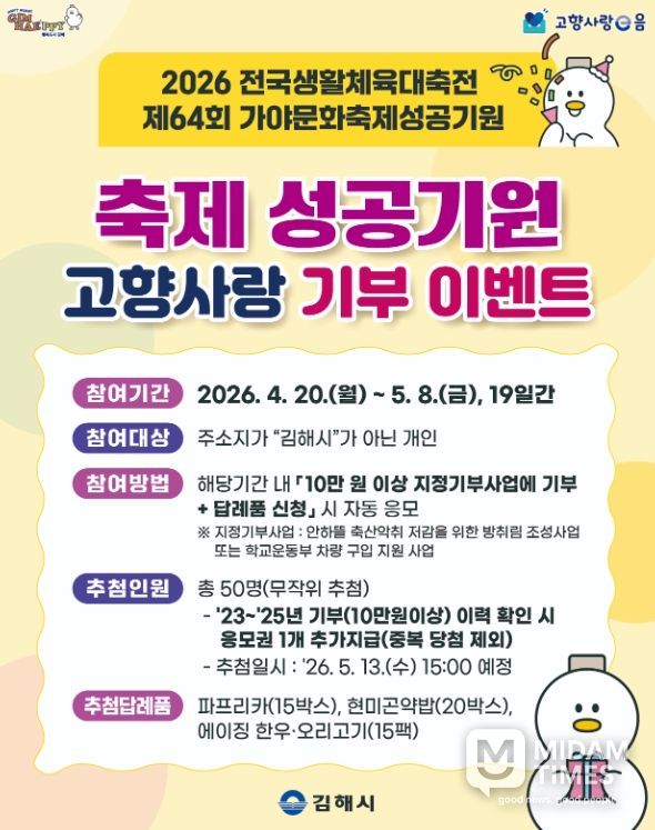 미담타임스 황명수 기자 | 김해시는 대규모 체육·문화 행사의 성공적 개최를 기원하고 지역의 시급한 현안을 해결하는 지정기부 사업을 널리 알리기 위해 20일부터 5월 8일까지 19일간 ‘고향사랑 기부 혜택 플러스’ 이벤트를 실시한다.