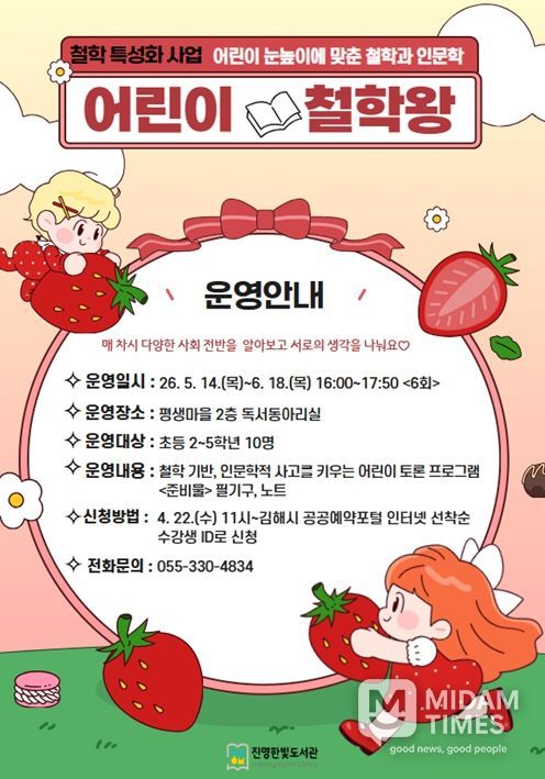 ‘어린이 철학왕’ 참가 신청은 오는 22일 오전 11시부터 김해시 공공예약포털에서 할 수 있다.