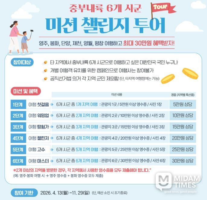 영주시 관계자는 “이번 챌린지 투어를 통해 많은 분이 중부내륙 6개 지역의 다채로운 매력을 발견하고, 지역 특산물까지 챙겨가는 즐거운 여행을 경험하시길 바란다”고 말했다.