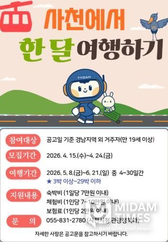 미담타임스 황명수 기자 | 사천시는 체류형 관광 활성화와 지역 관광자원 홍보를 위해 ‘사천에서 한 달 여행하기’ 1차 참가자를 4월 15일부터 4월 24일까지 모집한다.